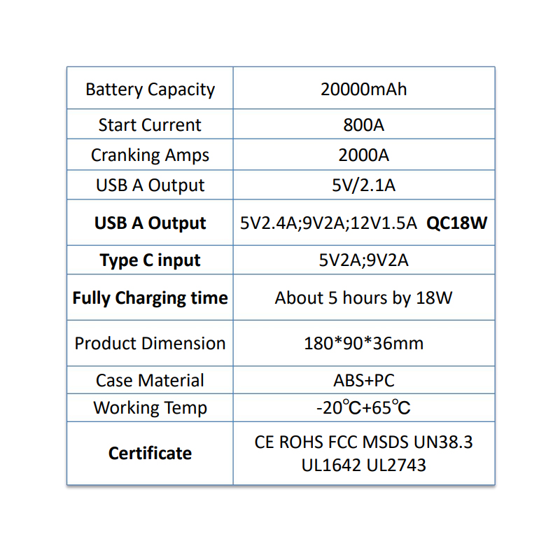 • Πιστοποιήσεις: CE, ROHS, FCC, MSDS, UN38.3, UL1642, UL2743