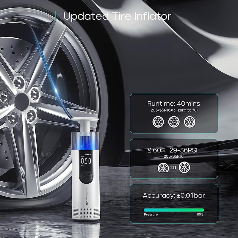 Διαθέτει φακό LED στο πάνω μέρος της σε περίπτωση που θέλετε να τη χρησιμοποιήσετε στο σκοτάδι. Καθώς φορτίζει μέσω USB, σας δείχνει το επίπεδο φόρτισης της μπαταρίας. Πιέστε το κουμπί εναλλαγής και επιλέξτε μεταξύ των ενοτήτων: PSI, BAR, KPA. Μπορείτε να αυξομειώσετε την πίεση του αέρα πιέζοντας τα κουμπιά.