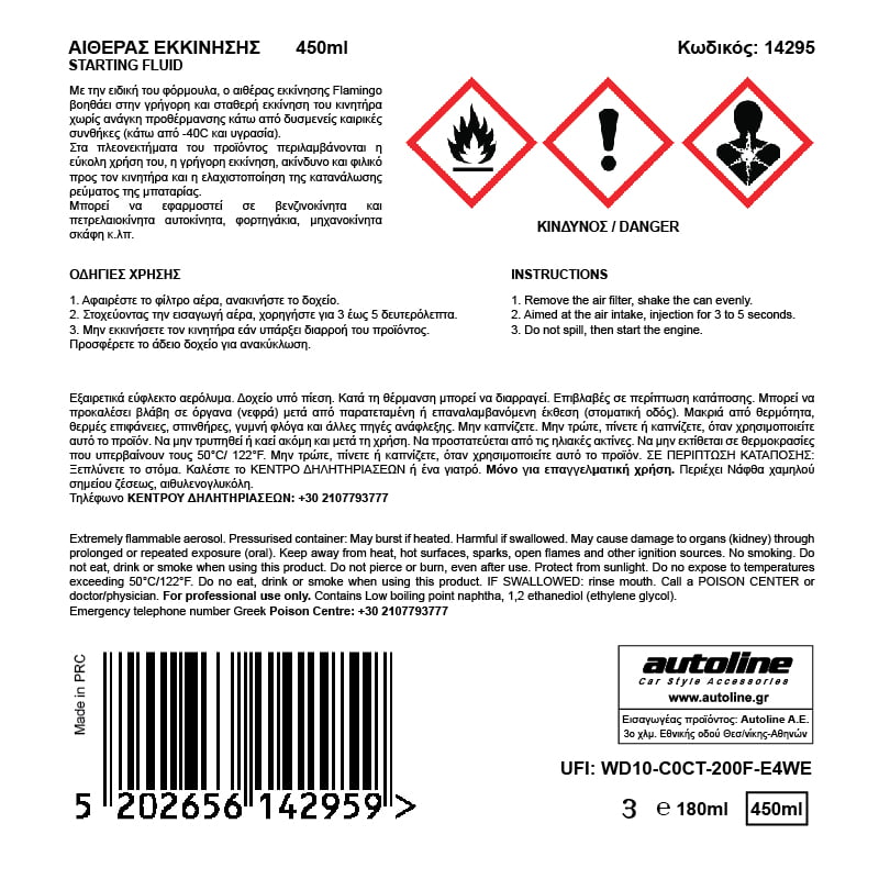 Ο Αιθέρας Εκκίνησης Flamingο με την ειδική του φόρμουλα, βοηθάει στην γρήγορη και σταθερή εκκίνηση του κινητήρα χωρίς την ανάγκη προθέρμανσης κάτω από δυσμενείς καιρικές συνθήκες (κάτω από -40C και υγρασία).